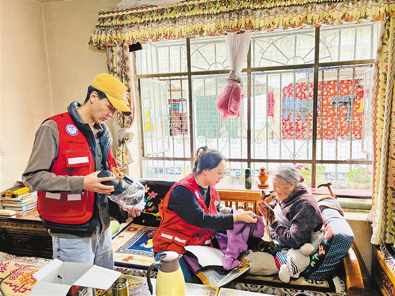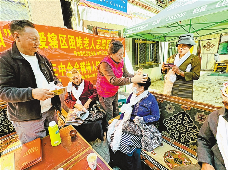冲赛康社区志愿者为老人送去保暖衣物、日常用品等,让每位老人都能感受到社区大家庭的温暖与关怀。丹杰林社区志愿者为老人送上爱心鞋和甜点等,并与老人围坐在一起拉家常,用“烟火气”聚起邻里情。