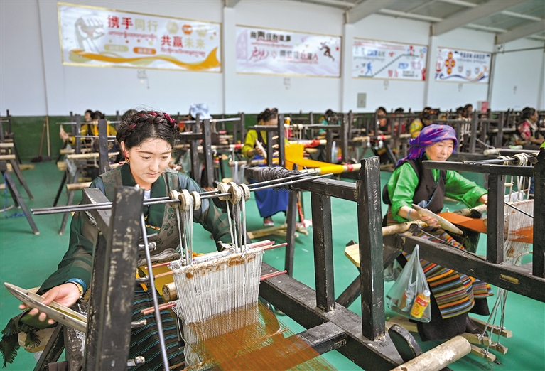 日喀则市仁布县康雄乡通过农牧民专业合作社的模式传承发展亚德细褐纺织手工艺,积极带动周边乡镇群众参与,2023年产值达2000万元,实现农民致富增收。 图为工作人员在车间里织布。新华社记者 孙瑞博 摄