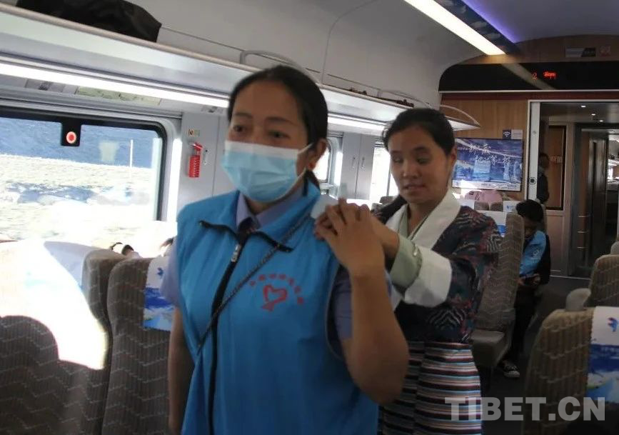 图为“三站一途 天路导航”团队在高原复兴号上帮助视障旅客