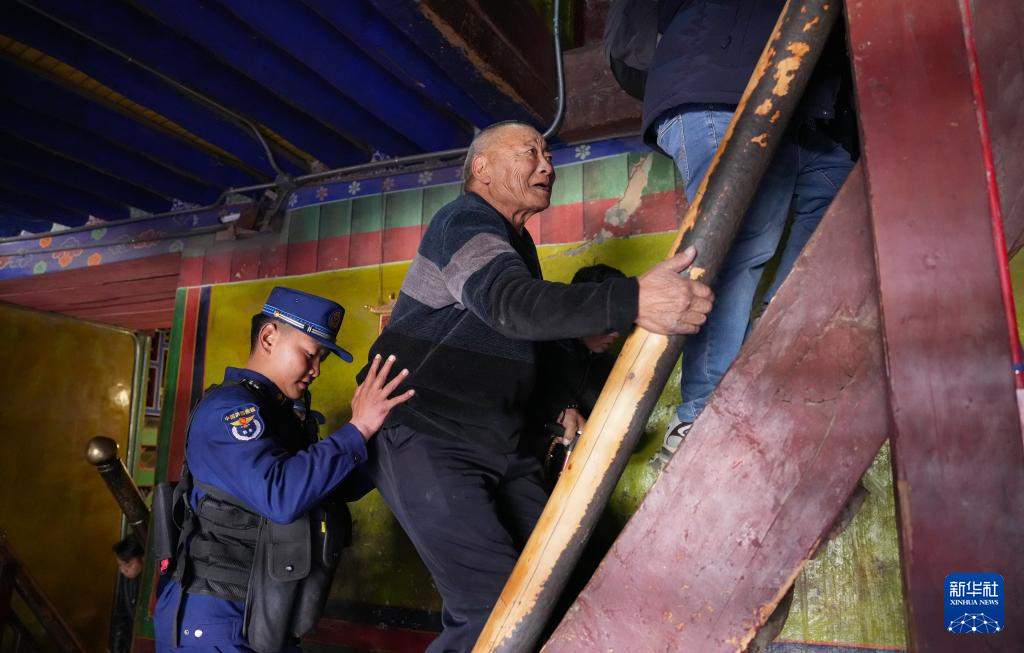 12月5日,布宫消防救援大队队员协助群众上楼梯。新华社记者 晋美多吉 摄