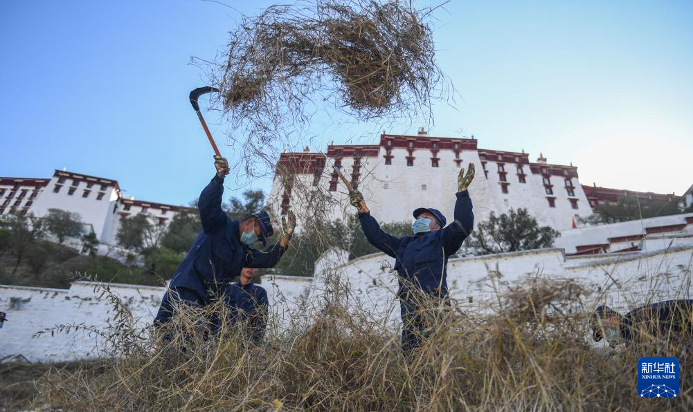 布宫消防救援大队队员在红山上除草,消除冬季布达拉宫火灾隐患(2019年11月6日摄)。新华社记者 晋美多吉 摄
