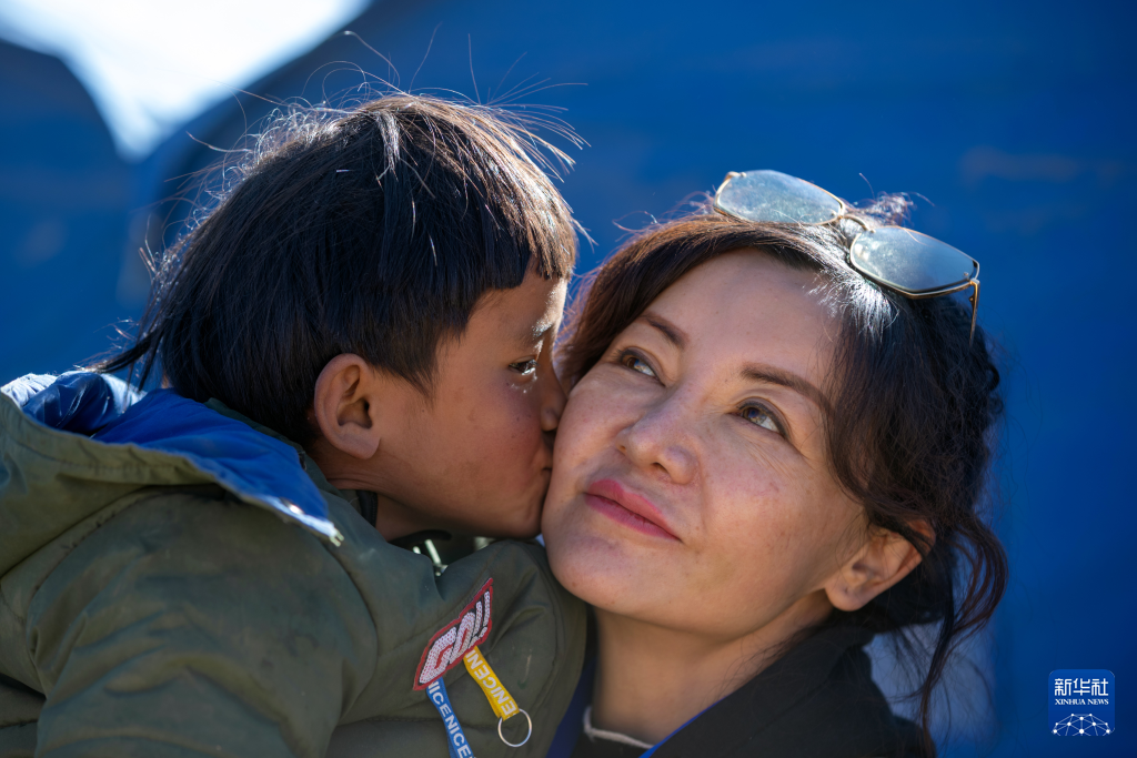 1月11日,6岁小女孩尼玛吉宗亲吻她的“甜心姐姐”。新华社记者沈伯韩 摄