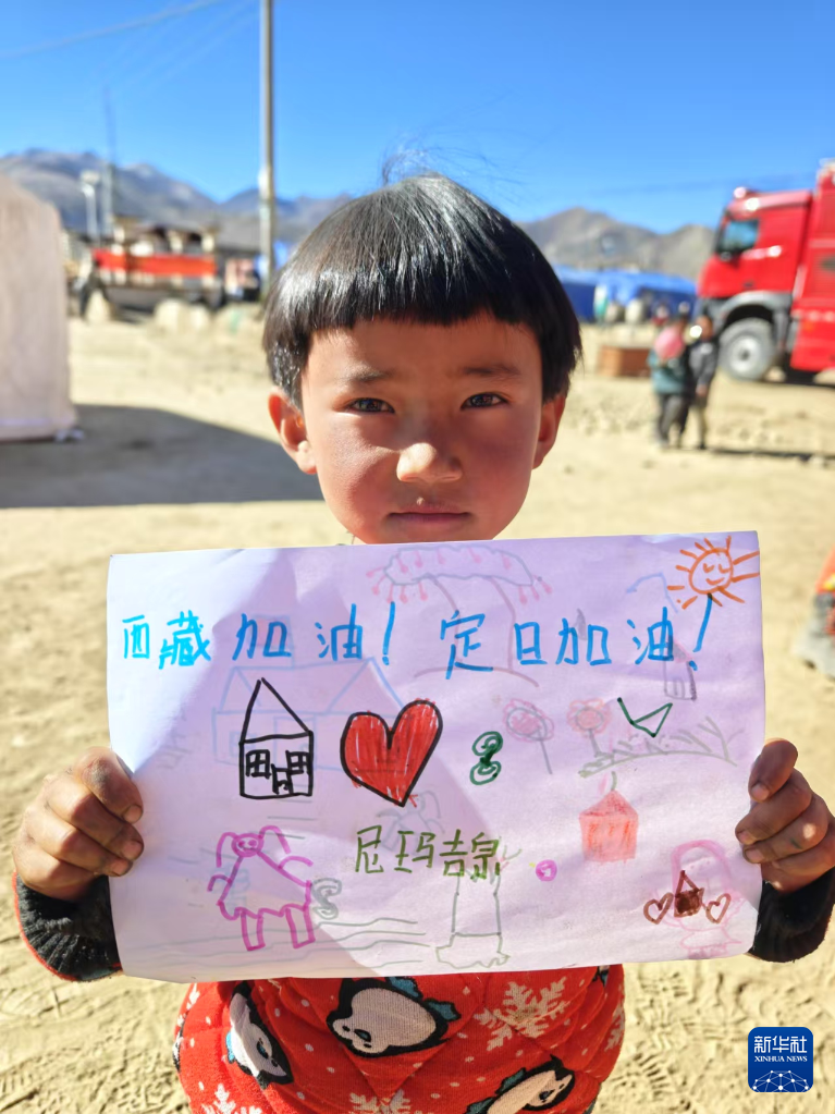 6岁的尼玛吉宗穿着花棉袄,先画了一顶小小的帐篷,在旁边画上了大大的红心,把梳着羊角辫的自己也画上去,天空画上了太阳。她想了想,工工整整地写上:“西藏加油!”“定日加油!”