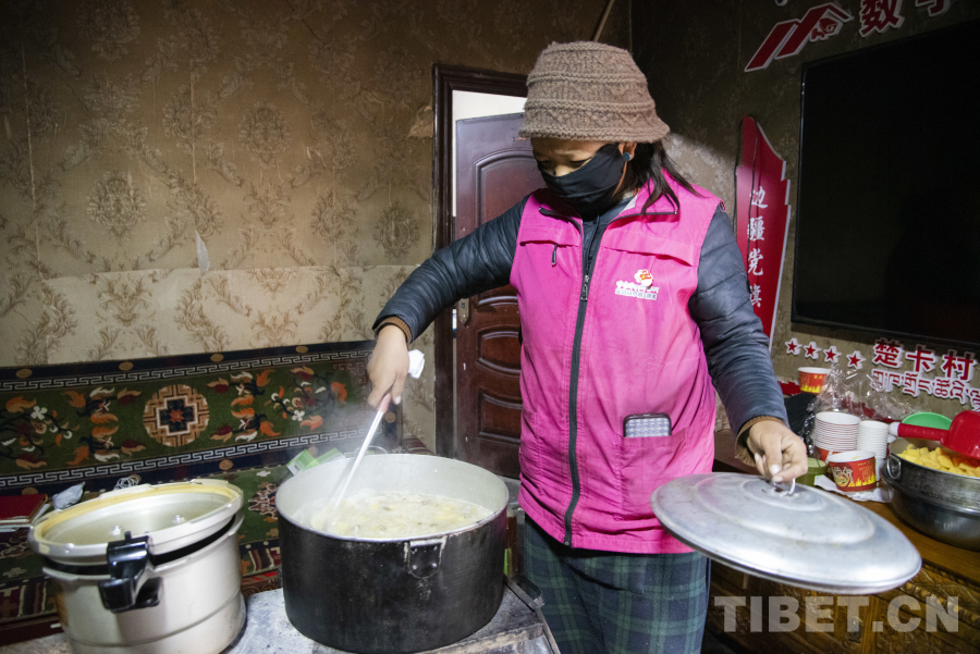 在楚卡村12岁以下的儿童、60岁以上的老人,以及一直以来工作在村安置点一线的工作人员共计70余人的三餐都由这个小小的厨房供给。达娃央宗说:“平常我们也会做一些酥油茶送给村中的老人,和他们喝茶聊天,就是给他们心理辅导。”