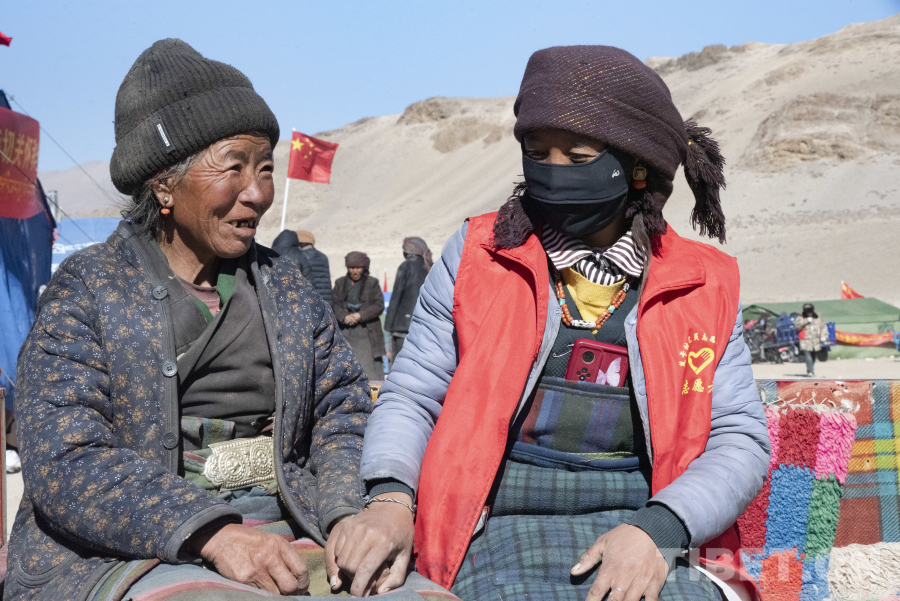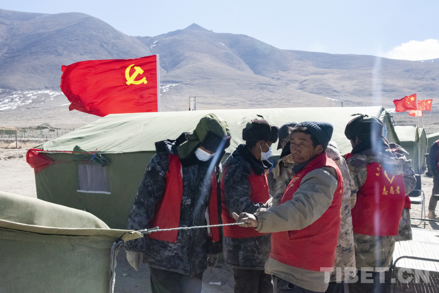 楚卡村村支书索朗正在和党员志愿者们一起为受灾安置点的帐篷进行加固。索朗告诉记者,2015年尼泊尔发生“4·25”地震时楚卡村受到了较大的影响,西藏自治区党委和政府在灾后对楚卡村房屋进行了加固和重建,正是得益于党的好政策,才让楚卡村在本次地震中没有人员伤亡,房屋也没有严重的坍塌。虽然楚卡村群众经历过较大的地震,但在这次地震发生后群众的恐慌情绪还是存在的,村内的党员干部们第一时间将安置措施及情况通报给村民,虽然他们现在仍然居住在安置帐篷内,但他们知道将很快住上板房,对未来的重建充满了期待。