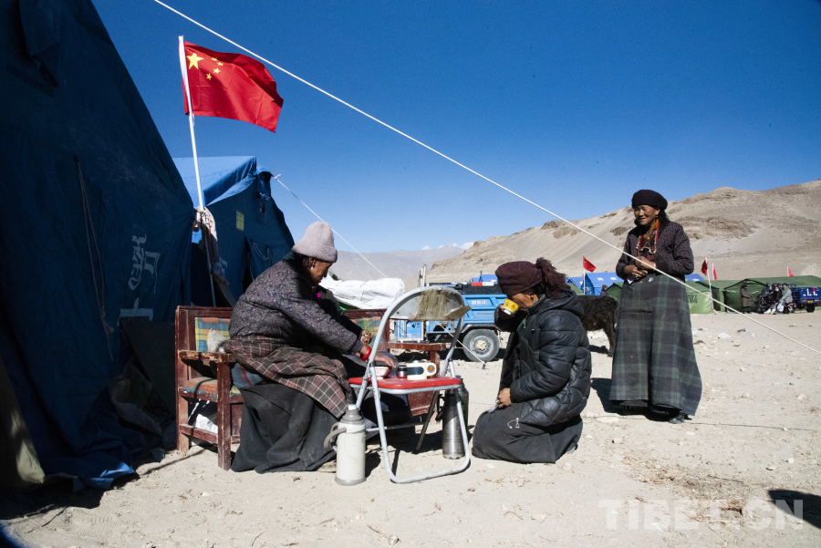 图为楚卡村安置点村民正在帐篷外喝酥油茶 摄影:赵振宇