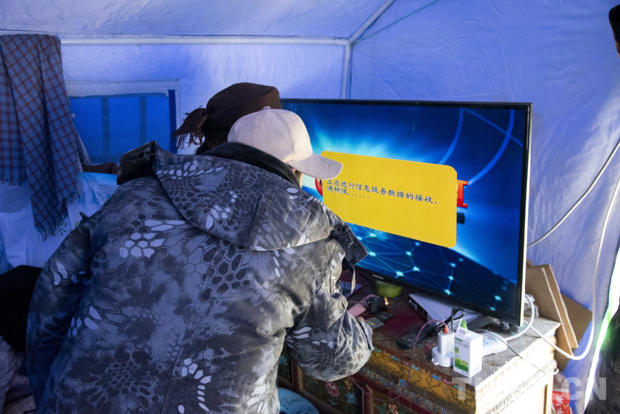 图为楚卡村安置点村民正在帐篷内调试电视机 摄影:赵振宇
