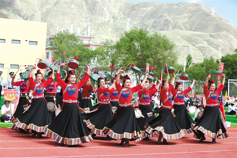 图为乡镇代表队身着民族服装出场,并在行进中表演节目。记者 丹增群培 通讯员 伦珠泽仁 摄