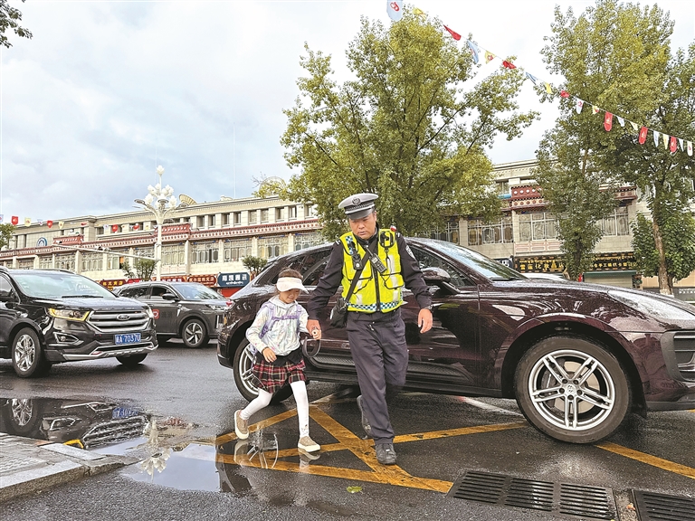 图为拉萨市公安局交通管理支队民警帮助独行的学生穿过车流。记者 鹿丽娟 摄