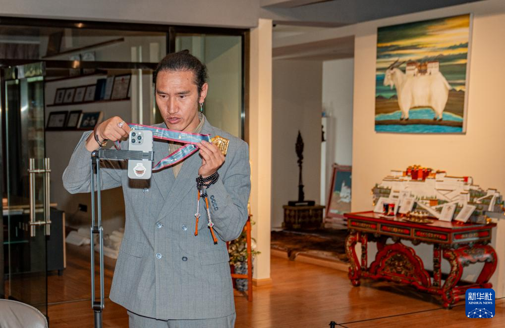 在西藏雅阔热品牌设计有限公司,扎西巴单在直播推介文创产品(9月16日摄)。新华社记者 丁增尼达 摄
