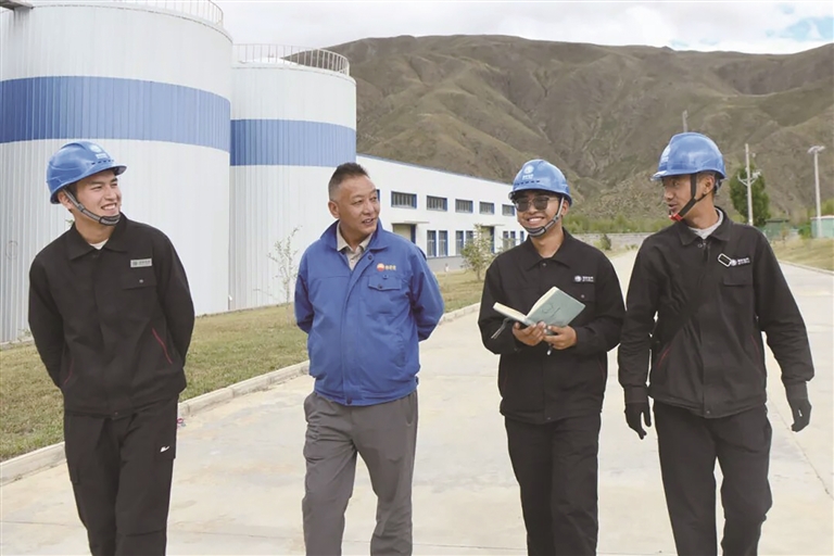 阿旺扎西(右)与同事在做检修。