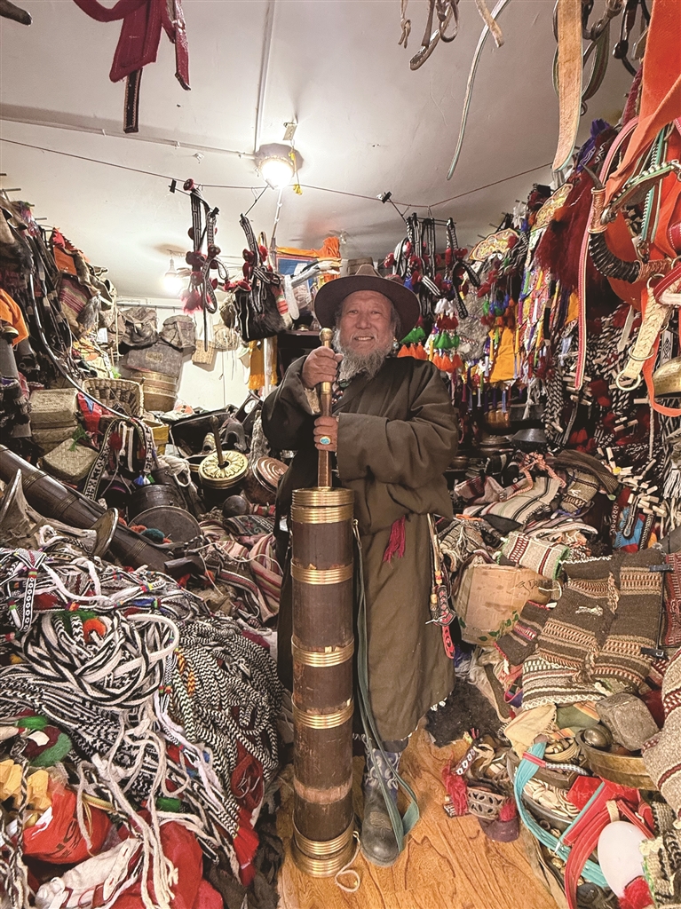 店主次仁罗布坐在一旁懒散地晒着太阳,他穿着一身深褐色藏袍,宽檐呢帽压着花白鬓角,银白长须垂到衣襟。耳上坠着的绿松石让他显得格外有气势,但他笑起来时又带着一种既温和又松弛的气质。他的松弛体现在每一个细节中,找货时得翻遍半间店,却从不嫌麻烦;讲起每件老物件的来历,语速缓慢且风趣……