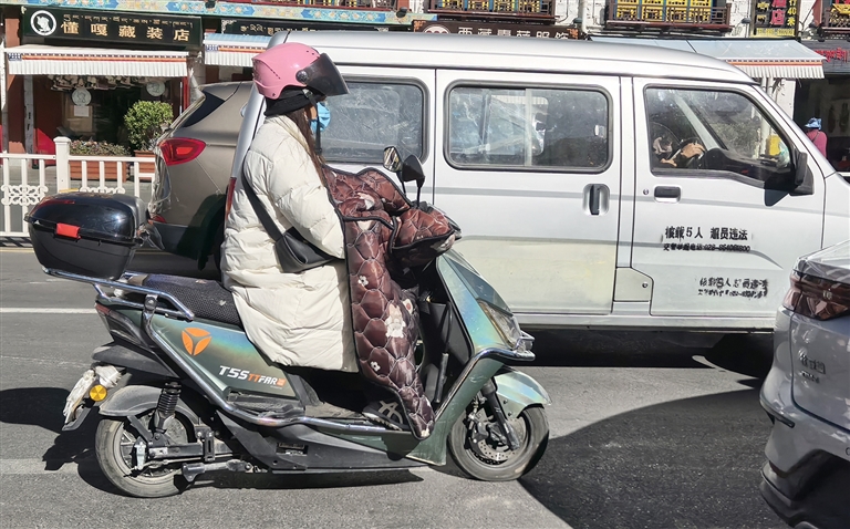 其次,冬季路面条件复杂,可能伴有结冰、霜冻等情况,电动车轮胎抓地力会下降,所以无论采用何种保暖方式,都必须减速慢行,与前车保持比平时更长的安全距离,给自己留有充分的反应时间和空间。最后,要定期检查车辆,确保刹车、轮胎等关键部件性能良好,避免因车辆故障引发事故。骑行过程中还要严格遵守交通规则,正确佩戴安全头盔,不闯红灯、不逆行、不随意变道,做到安全文明出行。贵桑次珠说:“冬季骑行时,由于穿着厚实,身体灵活度和观察力都会受到一定影响,所以骑电动车出行要时刻保持警惕,注意观察周围环境和路况,确保安全以后再通过,切勿因追求温暖而忽视潜在风险,选择科学的御寒方式,才能让温暖与安全一路同行。”(文/图 记者 娄梦琳)