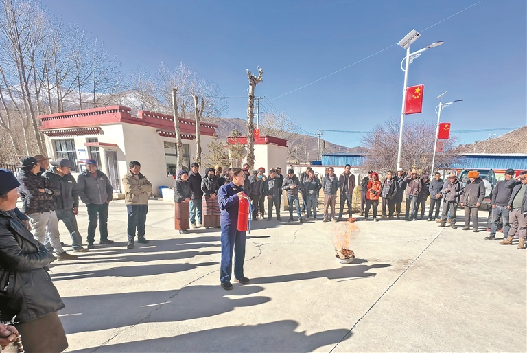 近日,墨竹工卡县采用县乡村三级联动模式,联合消防部门在扎西岗乡加尔多村开展消防安全宣传培训、隐患排查及器材配发活动。工作人员用汉藏双语普及消防知识、演示器材操作。