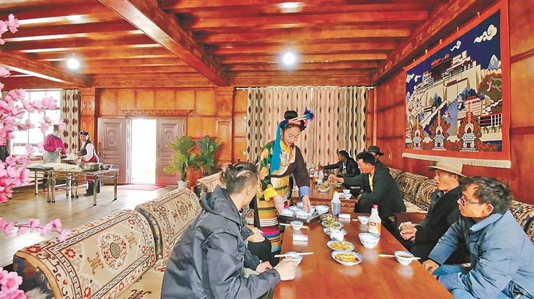 作为自治区级非遗传承人、芒康县“妇女致富带头人”的卓玛拉姆,于2010年开办盐井果拉丛农家乐,凭借着正宗的加加面风味和热情的服务,逐渐积累了口碑。2012年,在各级政府的支持下,她采用“民族特色餐饮+乡村旅游接待”的经营模式,生意日益红火。2017年,通过贷款300万元、自筹160万元翻建了农家乐,将其升级为综合型的民族特色餐饮店,经营规模大幅扩大,最多时日接待游客达300余人。