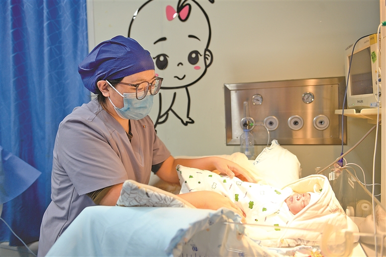 1月1日,自治区人民医院妇产科助产医生次拉在包裹新生儿。记者 潘多 摄