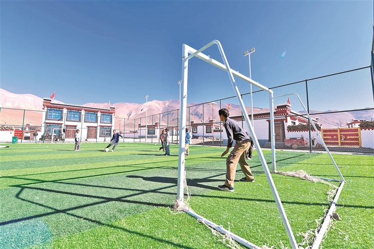 图为定日县长所乡森嘎村新修建的足球场上,孩子们在踢足球。记者 旦增嘎瓦 杨子彦 扎西顿珠 摄