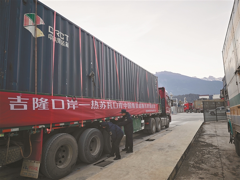 长期以来,中尼跨境货物运输主要依赖尼泊尔货柜车承运,货物在口岸需进行倒装、换装等操作,不仅影响效率,也增加货损风险。为推动跨境物流模式创新,吉隆海关主动对接地方政府与企业,提供全程政策指导,并依托“智慧鹰眼”,实时监测物流运输状态,延伸监管链条。同时,通过深化“提前申报”“即到即验即放”“无纸化通关”等便利措施,压缩口岸通关时间超50%,企业物流成本显著降低。