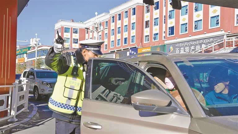 图为拉萨交警定点值守中。记者 鹿丽娟 摄