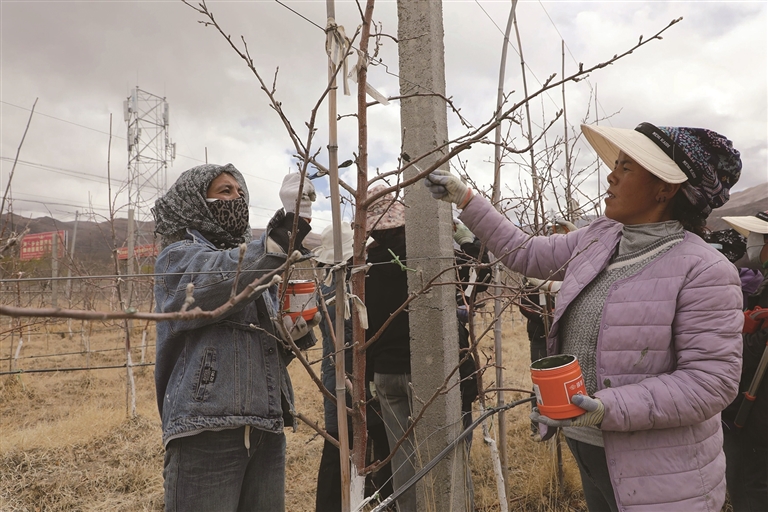 近日,在山南市扎囊县朗赛岭矮化苹果种植基地3号园区,春季果园管护工作正有序开展,果农们抢抓果树生长关键期,通过精细化作业筑牢丰产增收根基,让矮化苹果成为带动群众致富、助力乡村振兴的“致富果”。