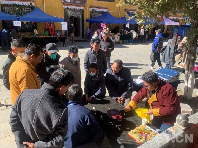 图为“古院市集|年味拉萨”活动现场当地市民在玩藏式骰子。