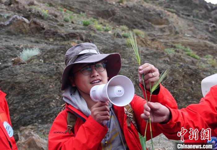 顾政权博士在西藏江孜特提斯喜马拉雅北带地层剖面附近青稞田畔,与科考队员交流青稞如何走上青藏高原。中新社记者 孙自法 摄