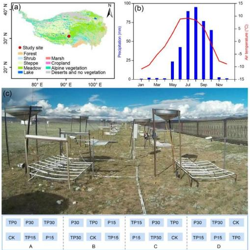 研究站点植被类型(a)、气象条件(b)和实验设计(c)。中科院青藏高原所 供图