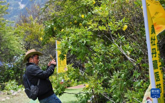 5月28日,一名游客在南伊珞巴民族乡扎贡沟拍摄野生大花黄牡丹。新华社记者 刘洲鹏 摄