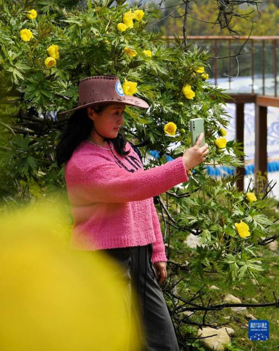 5月28日,一名游客在米林市南伊珞巴民族乡扎贡沟野生大花黄牡丹前自拍。新华社记者 张汝锋 摄