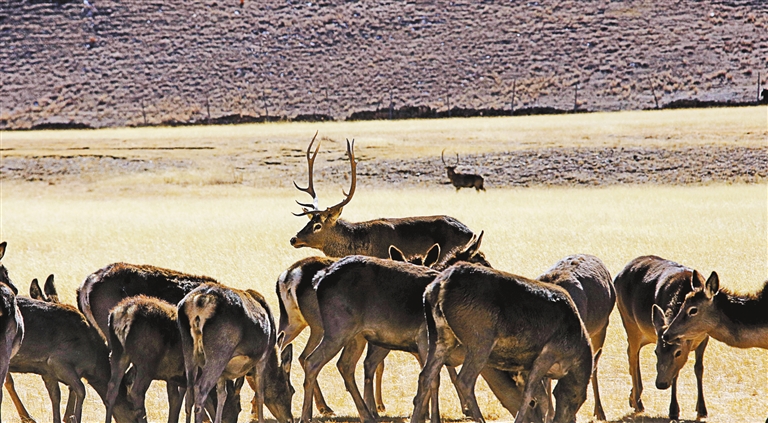 图为成群的西藏马鹿在悠闲地吃草。记者 白玛泽旺 摄