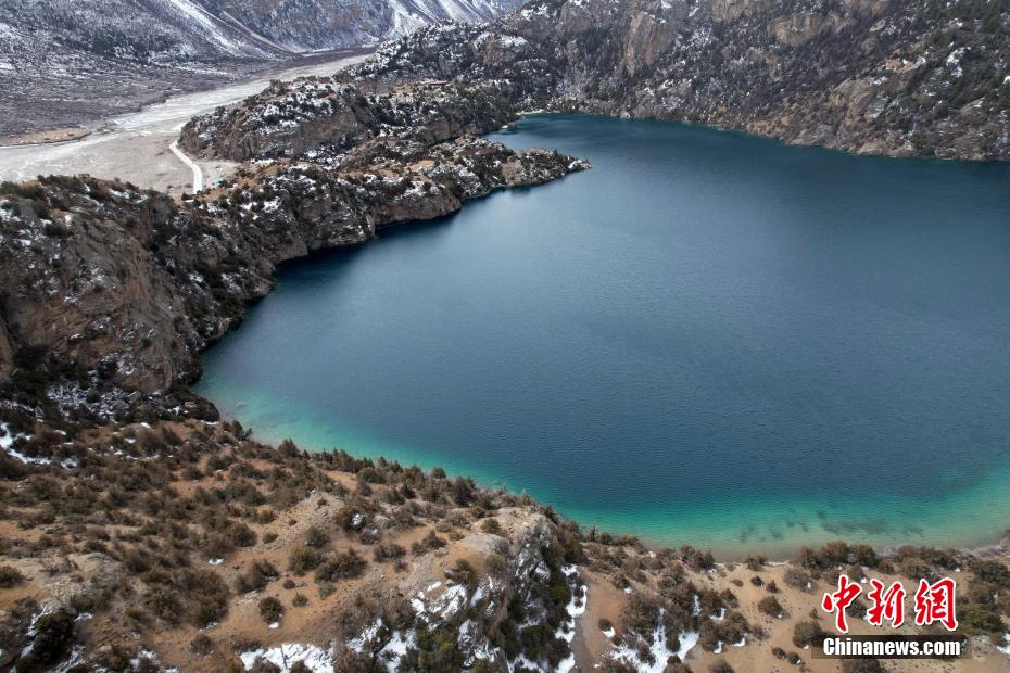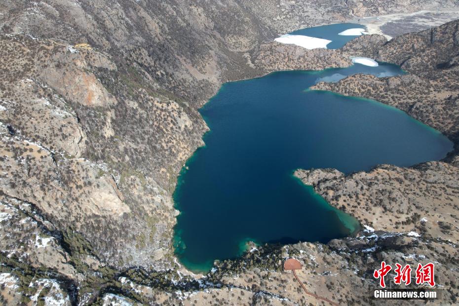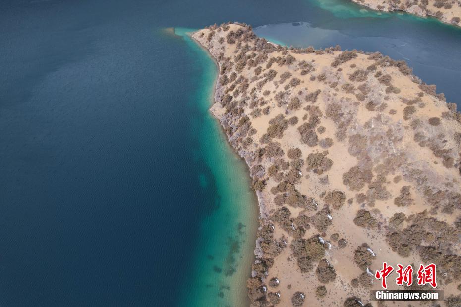 2月16日,位于西藏昌都市边坝县的“三色湖”在群山环抱中景色壮美。“三色湖”由黑湖、白湖、黄湖组成,群山环抱中的三处相邻湖泊在阳光下分别呈现不同色彩。图为三色湖景色。(无人机照片)中新社记者 李林 摄
