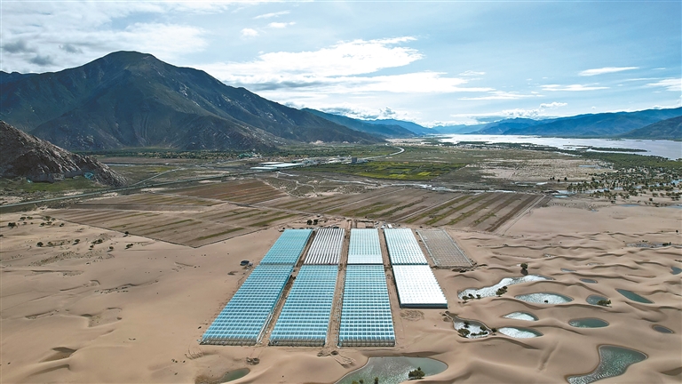 位于扎囊县的国家农业产业化示范企业——西藏绿之源现代农业科技股份有限公司二期项目,如同一片“绿洲”镶嵌在沙丘之中。记者 丹增平措 摄
