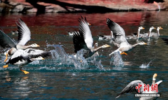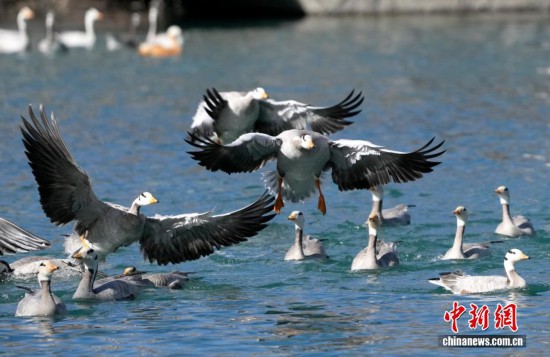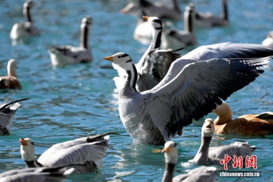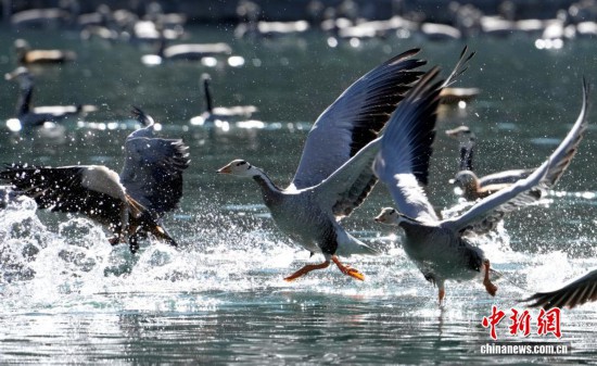 12月17日,西藏拉萨市区宗角禄康公园,大批斑头雁“集结”越冬。成群结队的斑头雁等越冬候鸟吸引市民游客驻足观赏、拍照留念。图为宗角禄康公园越冬的斑头雁。