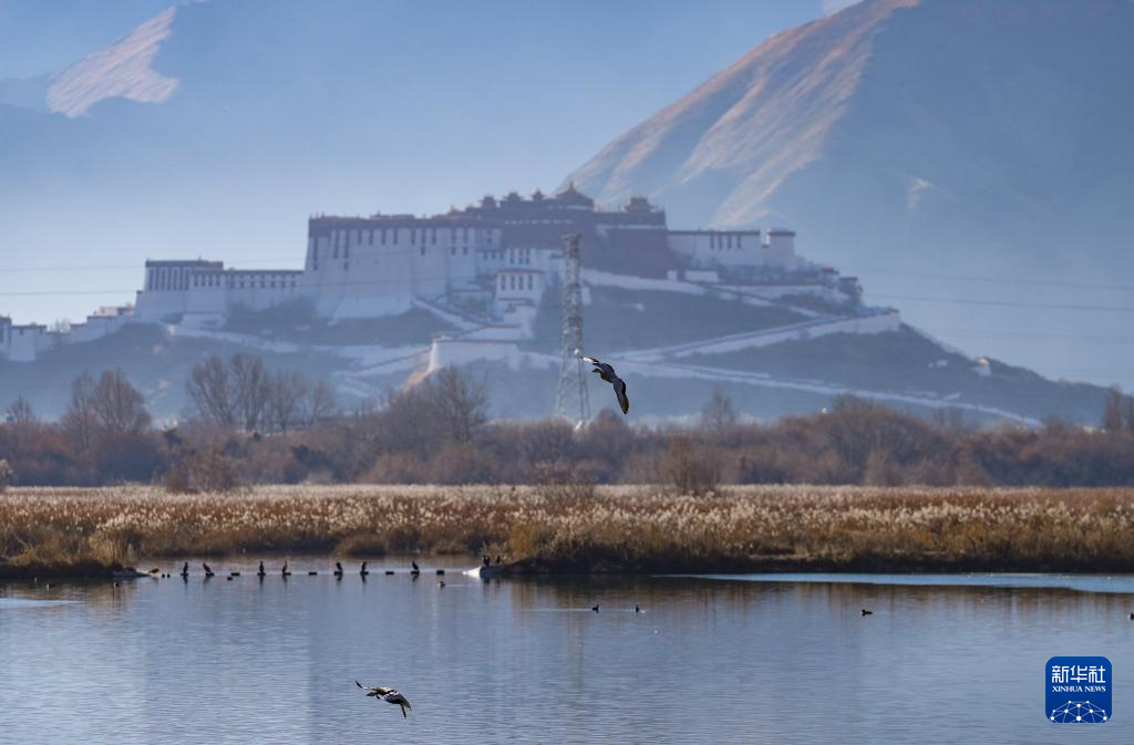12月20日,斑头雁飞翔在拉鲁湿地上空。