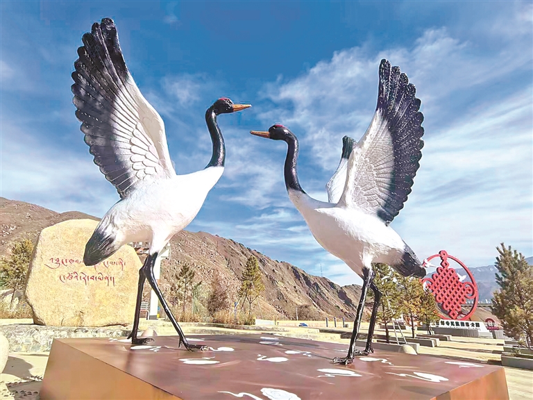 图为哲蚌寺民族团结主题公园内的拉萨市鸟黑颈鹤雕塑。