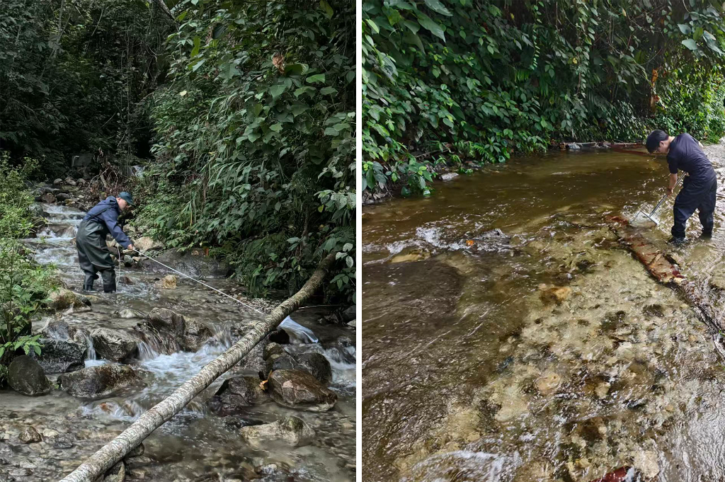图为墨脱流施密摇蚊栖息地环境照。上海海洋大学林晓龙副教授(左)和硕士研究生张智超(右)正在采集水生昆虫。(西藏自治区高原生物研究所“达娃创新工作室”供图)