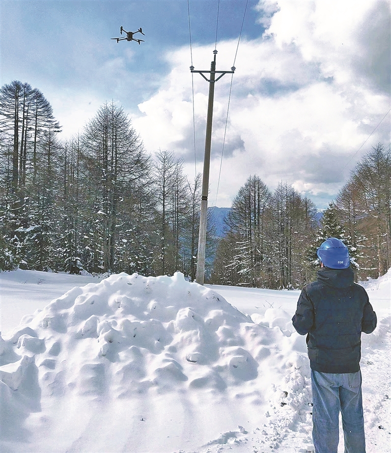 节日期间,昌都市左贡县普降大雪,为保障群众用电,国网左贡县供电公司供服中心工作人员对辖区内输电线路开展巡视工作,并利用无人机对覆冰线路进行空中巡查。