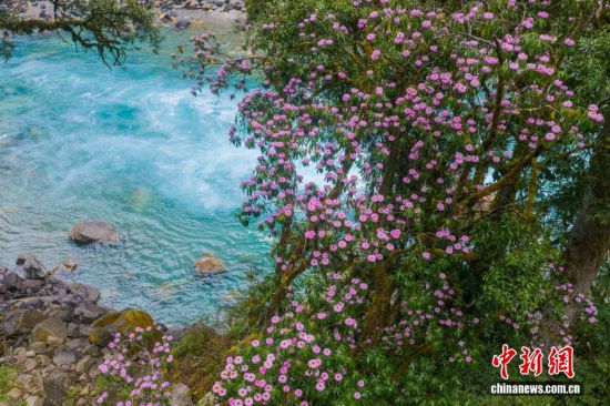 近日,流经西藏那曲市嘉黎县至林芝市波密县的易贡藏布(也称易贡河)流域,迎来高山杜鹃最佳观赏期。作为雅鲁藏布江的二级支流,易贡藏布两岸山峦叠嶂,高山峡谷间,成片高山杜鹃竞相绽放。粉白、紫红的花朵点缀于苍松翠柏之间,与蜿蜒的河流相互映衬,构成一幅壮丽的高原生态画卷。图为3月28日,奔腾的易贡藏布与盛开的高山杜鹃。