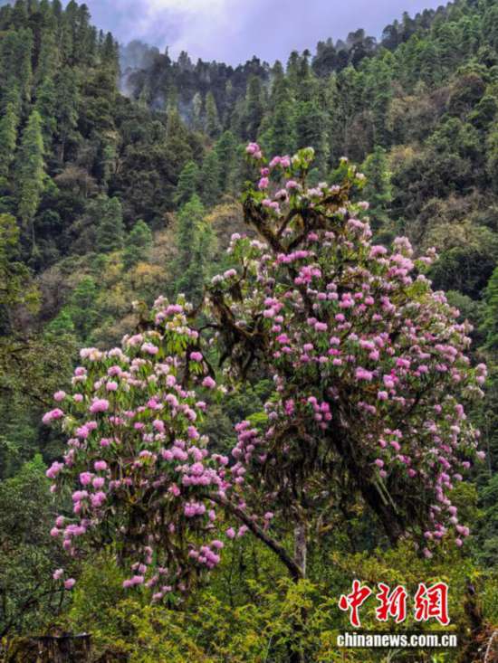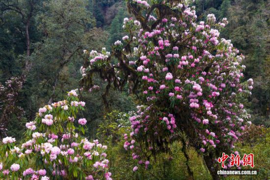 近日,流经西藏那曲市嘉黎县至林芝市波密县的易贡藏布(也称易贡河)流域,迎来高山杜鹃最佳观赏期。作为雅鲁藏布江重要二级支流,易贡藏布两岸山峦叠嶂,高山峡谷间,成片高山杜鹃竞相绽放。粉白、紫红的花朵点缀于苍松翠柏之间,与蜿蜒的河流相互映衬,构成一幅壮丽的高原生态画卷。图为3月28日,易贡藏布沿线的高山杜鹃花。