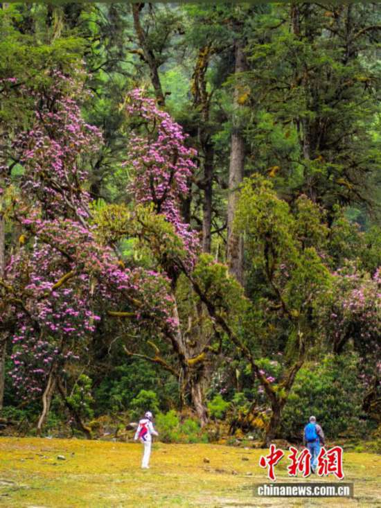 近日,流经西藏那曲市嘉黎县至林芝市波密县的易贡藏布(也称易贡河)流域,迎来高山杜鹃最佳观赏期。作为雅鲁藏布江重要二级支流,易贡藏布两岸山峦叠嶂,高山峡谷间,成片高山杜鹃竞相绽放。粉白、紫红的花朵点缀于苍松翠柏之间,与蜿蜒的河流相互映衬,构成一幅壮丽的高原生态画卷。图为3月28日,徒步爱好者行走在藏东南的森林里,远处高山杜鹃花点缀。