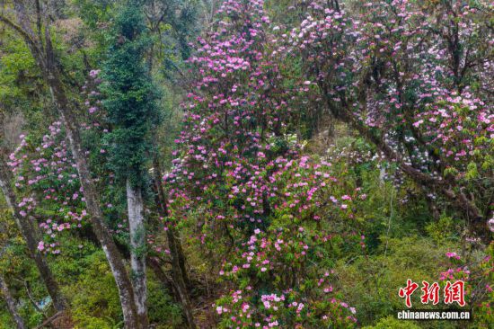 近日,流经西藏那曲市嘉黎县至林芝市波密县的易贡藏布(也称易贡河)流域,迎来高山杜鹃最佳观赏期。作为雅鲁藏布江重要二级支流,易贡藏布两岸山峦叠嶂,高山峡谷间,成片高山杜鹃竞相绽放。粉白、紫红的花朵点缀于苍松翠柏之间,与蜿蜒的河流相互映衬,构成一幅壮丽的高原生态画卷。图为3月28日,高山峡谷间盛放的高山杜鹃花。