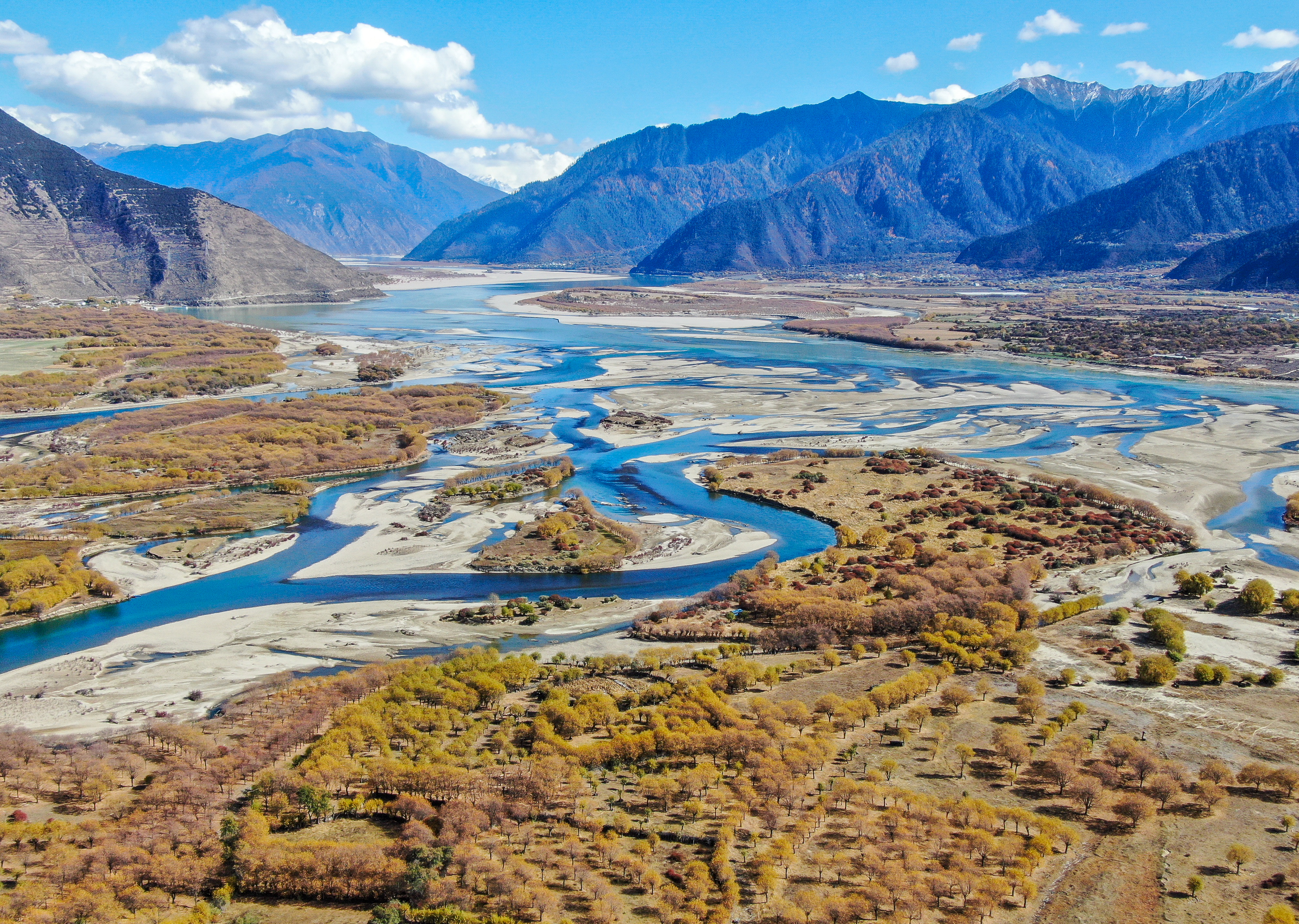 图为林芝市巴宜区尼洋河生态景观带沿线风光。那泛着蓝光的河水,如游动的缎带,绕着河洲和村庄,纵横成网,流向宽阔的雅鲁藏布江。