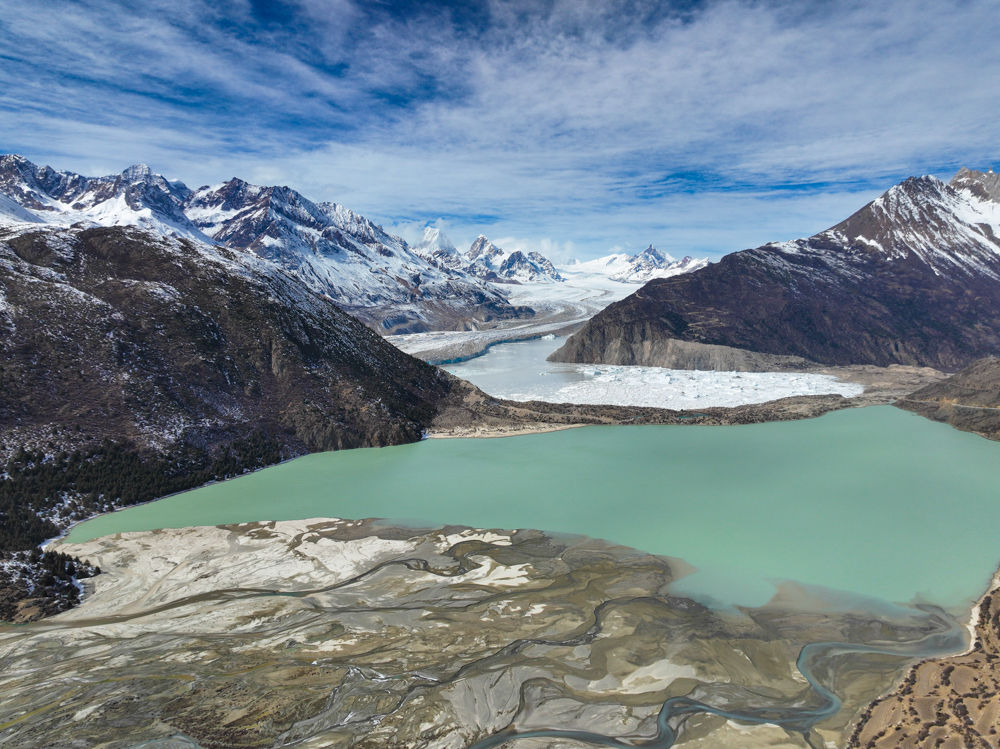 冬日时节,位于西藏昌都市八宿县境内的来古冰川与蓝天、湖泊相互映衬,景色壮美。