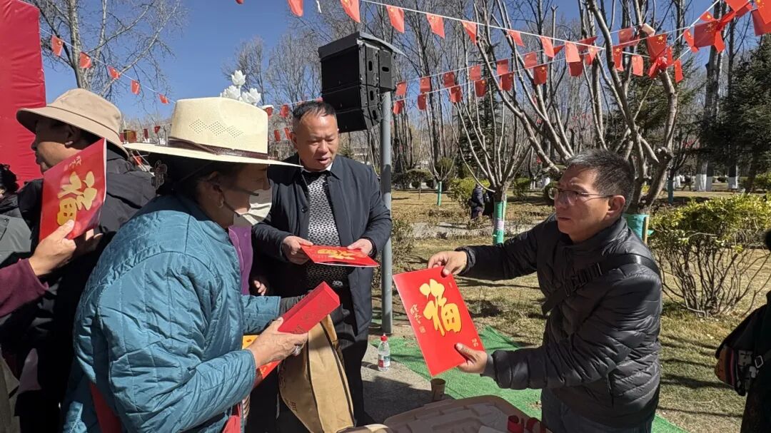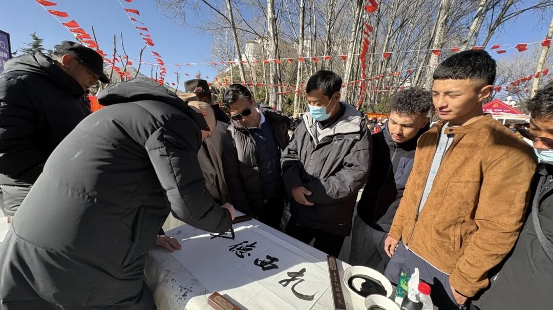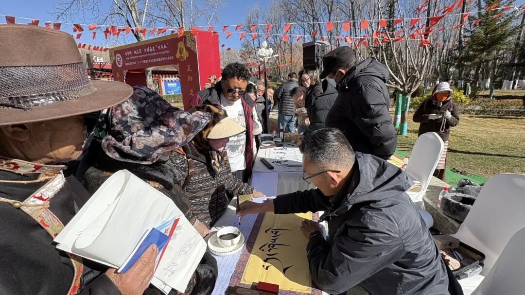 活动现场暖意融融、墨香四溢。6名汉藏书法志愿者们挥毫泼墨、笔走龙蛇,将美好祝福凝于笔端,现场创作汉藏书法作品、书写“扎西德勒”,一幅幅笔墨饱满、寓意吉祥的作品次第呈现,既有传统韵味,又饱含家国情怀与雪域风情。志愿者们把一幅幅“福”字、一副副春联免费赠与过往群众和游客,用笔墨传递温暖,用文艺服务人民,引得市民驻足观赏、踊跃领取,现场欢声笑语不断,处处洋溢着文明和谐的浓厚氛围。