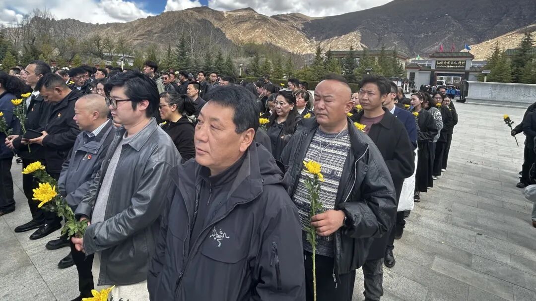 祭扫仪式在庄严肃穆的烈士纪念碑前正式开始,全体人员垂首肃立,向为西藏和平解放、修筑进藏公路、民主改革以及社会主义建设事业英勇献身的烈士们默哀。随后敬献鲜花,瞻仰烈士墓区,气氛庄重而肃穆。