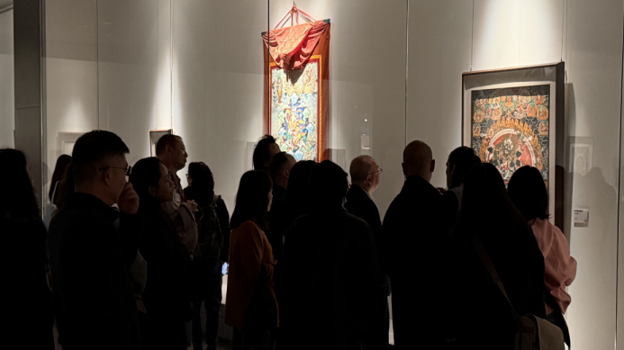 周明晖就展览架构进行了专业解读。本次展览精心设置“蕴”与“绽”两大板块,构建起传统与当代的深度对话格局。“蕴”板块集中展示了勉唐、钦孜、噶赤、尼泊尔、齐乌岗巴等代表性唐卡画派的经典之作,凭借天然矿物颜料的独特质感与精湛卓绝的绘制技艺,生动呈现了藏地千年文脉的传承与汉藏艺术交融的深厚积淀。“绽”板块则聚焦当代视野,展出了一批以布面重彩、中国画、油画、版画等形式创作的西藏题材新作,艺术家们运用新的艺术语言诠释新时代高原的发展变迁与人文风貌,彰显了西藏美术在传承中求变、在创新中发展的蓬勃活力。