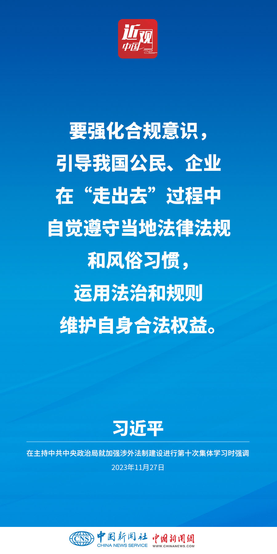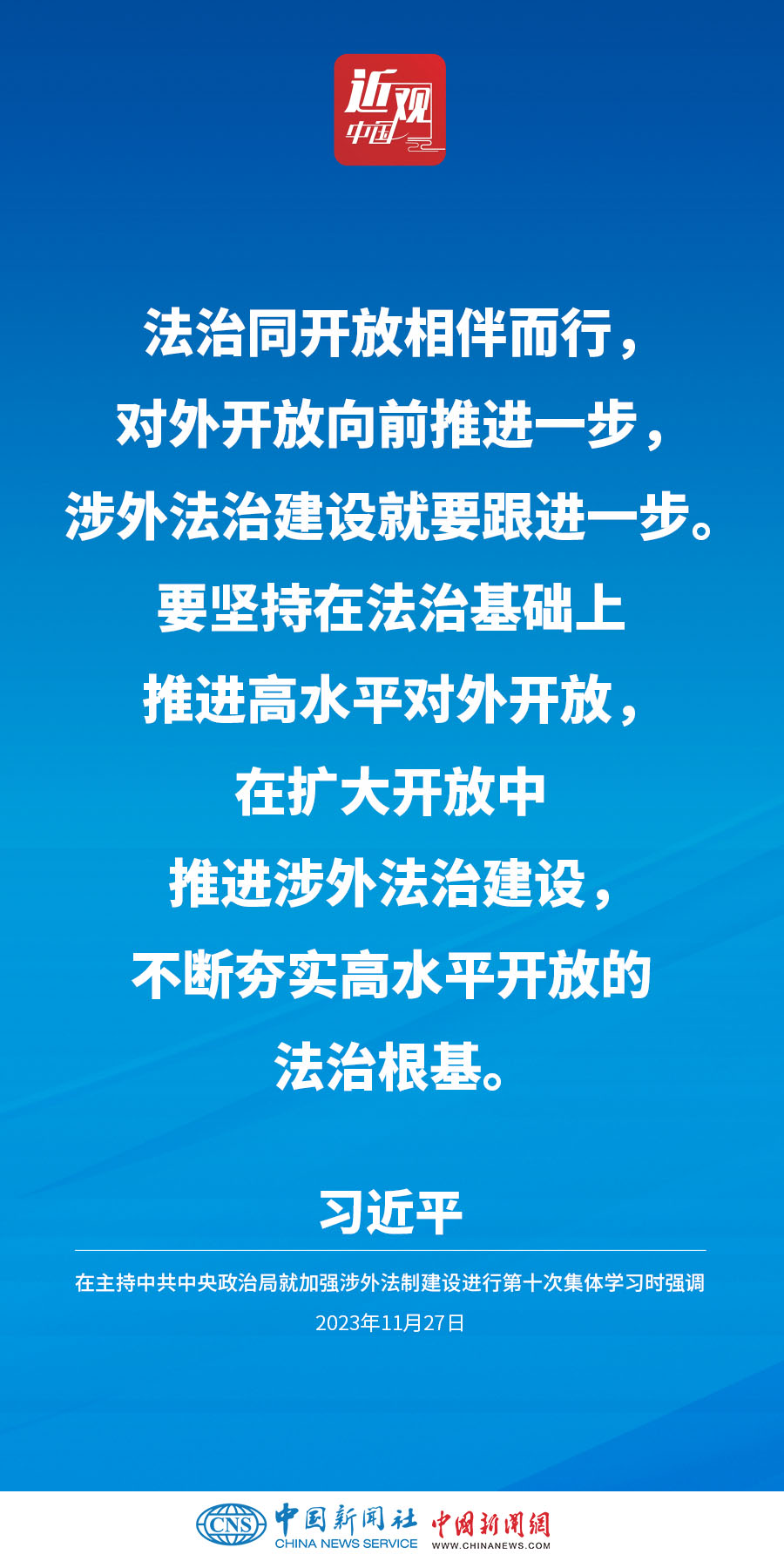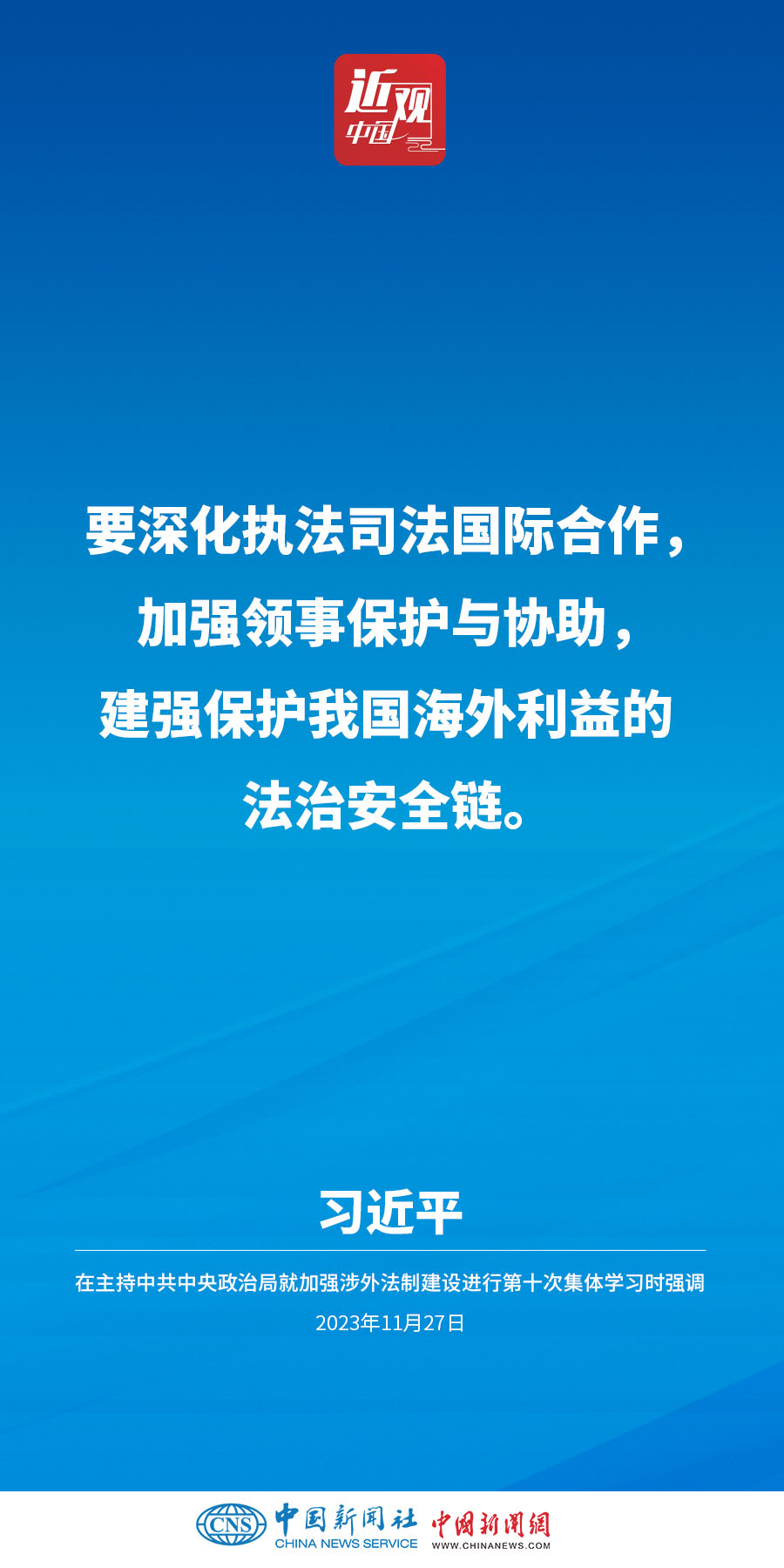 中共中央政治局11月27日下午就加强涉外法制建设进行第十次集体学习。中共中央总书记习近平在主持学习时强调,加强涉外法治建设既是以中国式现代化全面推进强国建设、民族复兴伟业的长远所需,也是推进高水平对外开放、应对外部风险挑战的当务之急。要从更好统筹国内国际两个大局、更好统筹发展和安全的高度,深刻认识做好涉外法治工作的重要性和紧迫性,建设同高质量发展、高水平开放要求相适应的涉外法治体系和能力,为中国式现代化行稳致远营造有利法治条件和外部环境。他指出——