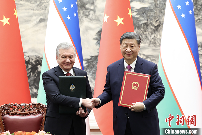 米尔济约耶夫表示,我今年首次出访选择中国,具有重要象征意义。乌中人民拥有千年传统友好,两国关系保持高水平发展。我每次到访中国,都对中国改革发展取得的辉煌成就赞叹不已。归功于习近平主席的英明领导,中国在经济发展、创新能力等很多方面已经成为世界强国,相信中国一定会在实现中华民族伟大复兴中国梦的征程上取得新的更大成就。乌兹别克斯坦愿意学习借鉴中国成功发展经验,成为现代化道路上的同路人,造福两国人民。乌中关系基于高度政治互信、相互尊重和互帮互助。我完全赞同习近平主席对进一步发展两国关系的意见,很高兴同习近平主席共同宣布,将乌中关系提升为新时代全天候全面战略伙伴关系,期待以我此次访问为重要契机,进一步巩固深化互信,拓展全方位合作,高质量共建“一带一路”,推动经贸、农业、绿色能源、地方、旅游等各领域务实合作取得更多成果,密切人文交流。乌方坚定恪守一个中国原则,坚决反对外部势力干涉中国内政,愿在涉台、涉疆、人权等涉及中国核心利益问题上坚定支持中国,同中方共同打击“三股势力”,维护各自和地区安全稳定。近日,乌中两国举行了地方合作论坛、百校合作论坛、旅游推广和乌文化日、减贫论坛等丰富活动,其中很多都是乌历史上首次举办,充分证明了两国人民的友好情谊以及乌中关系取得的丰硕成果和巨大潜力。乌方坚定支持习近平主席提出的系列全球合作倡议,愿同中方积极落实推进。去年5月西安中国—中亚峰会对于加强地区互联互通和发展繁荣具有历史意义,乌方愿同中方密切协作,尽快建成中国—中亚机制秘书处,推动中国—中亚机制发展壮大,同时继续加强在上海合作组织等多边框架内沟通配合。我对乌中关系前景充满信心。