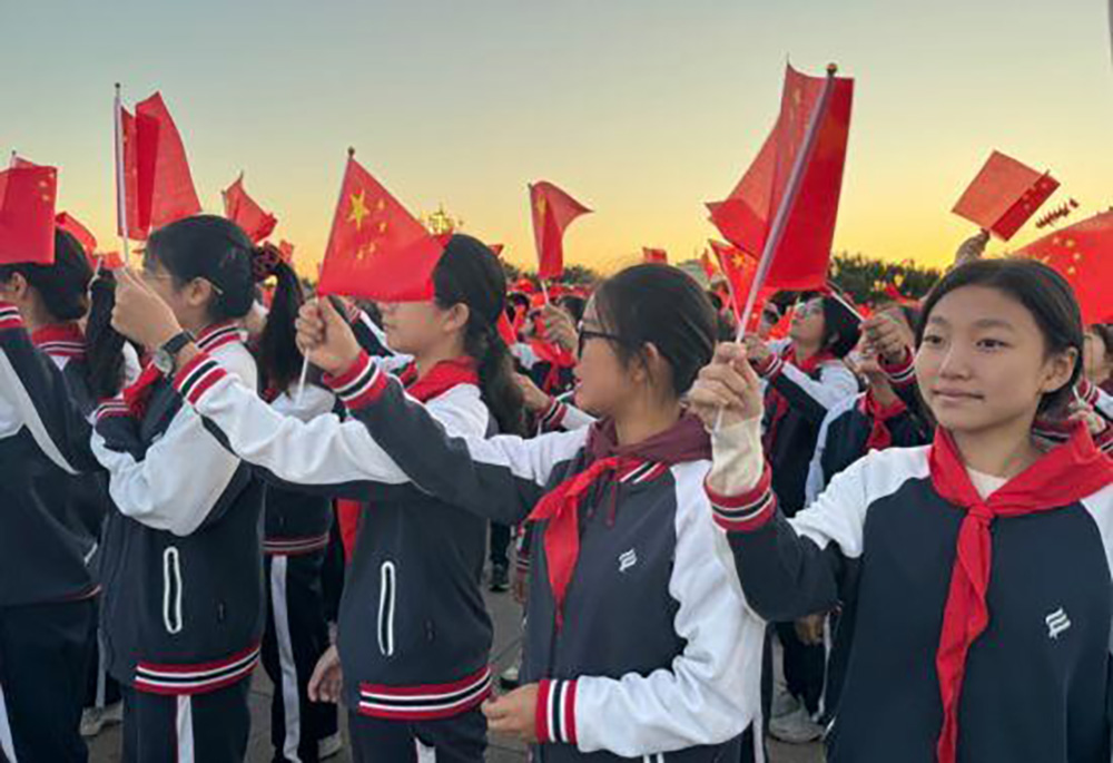 △2024年10月1日,天安门广场举行升国旗仪式,庆祝中华人民共和国成立75周年。北京2000名大中小学师生现场观礼升国旗仪式。