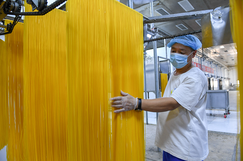 2024年1月25日,在吉林省公主岭市的一家公司车间,工人查看玉米面条生产情况。